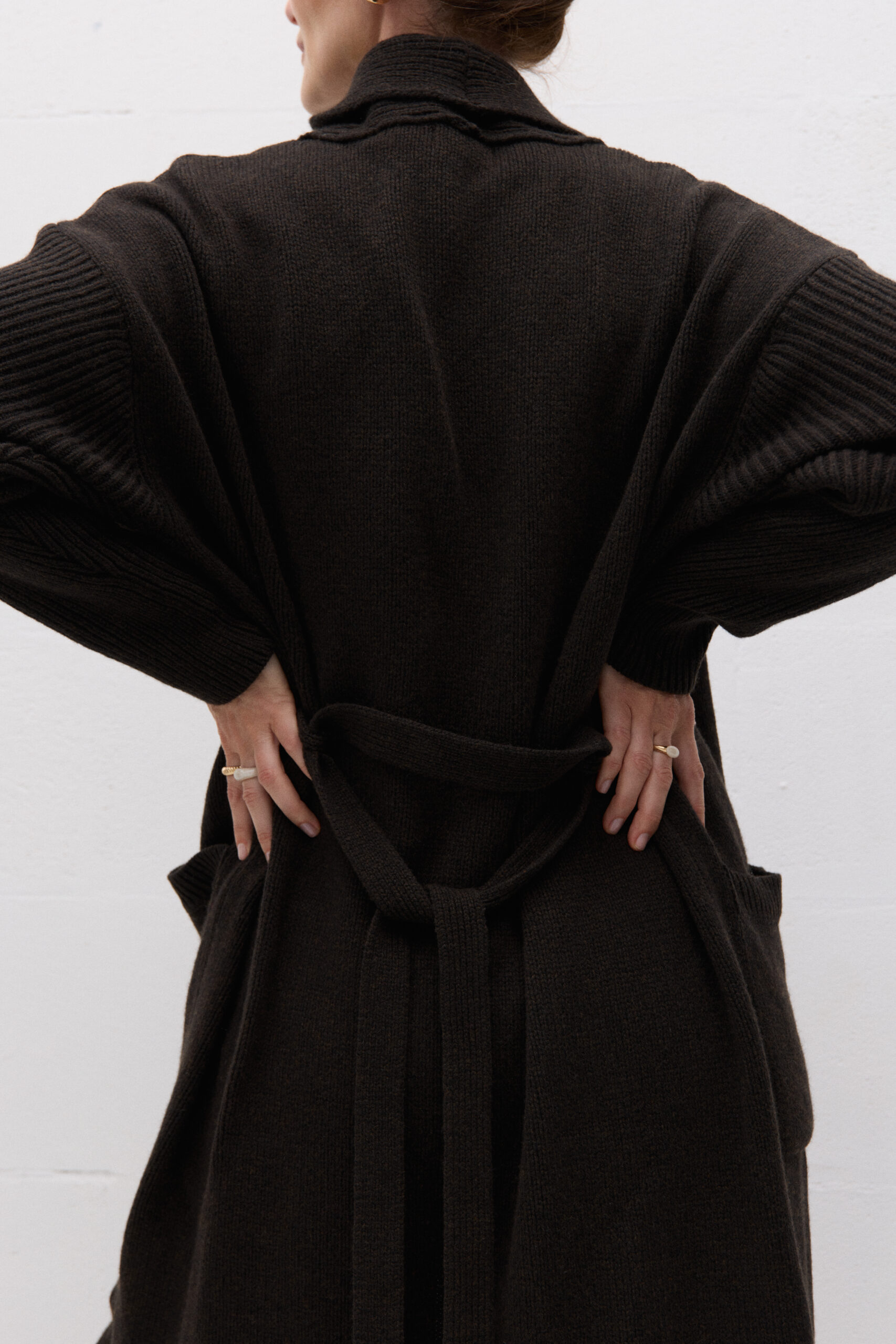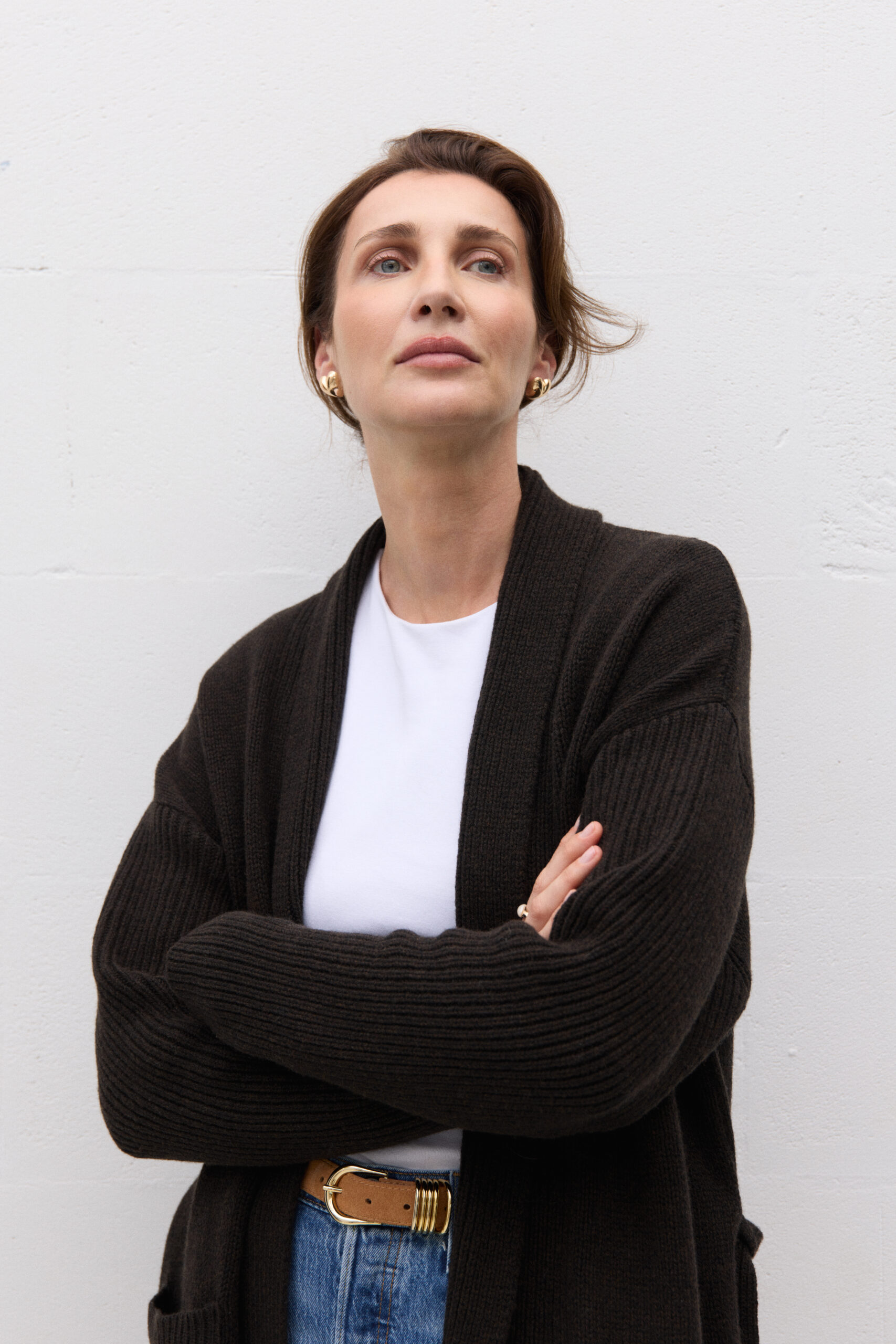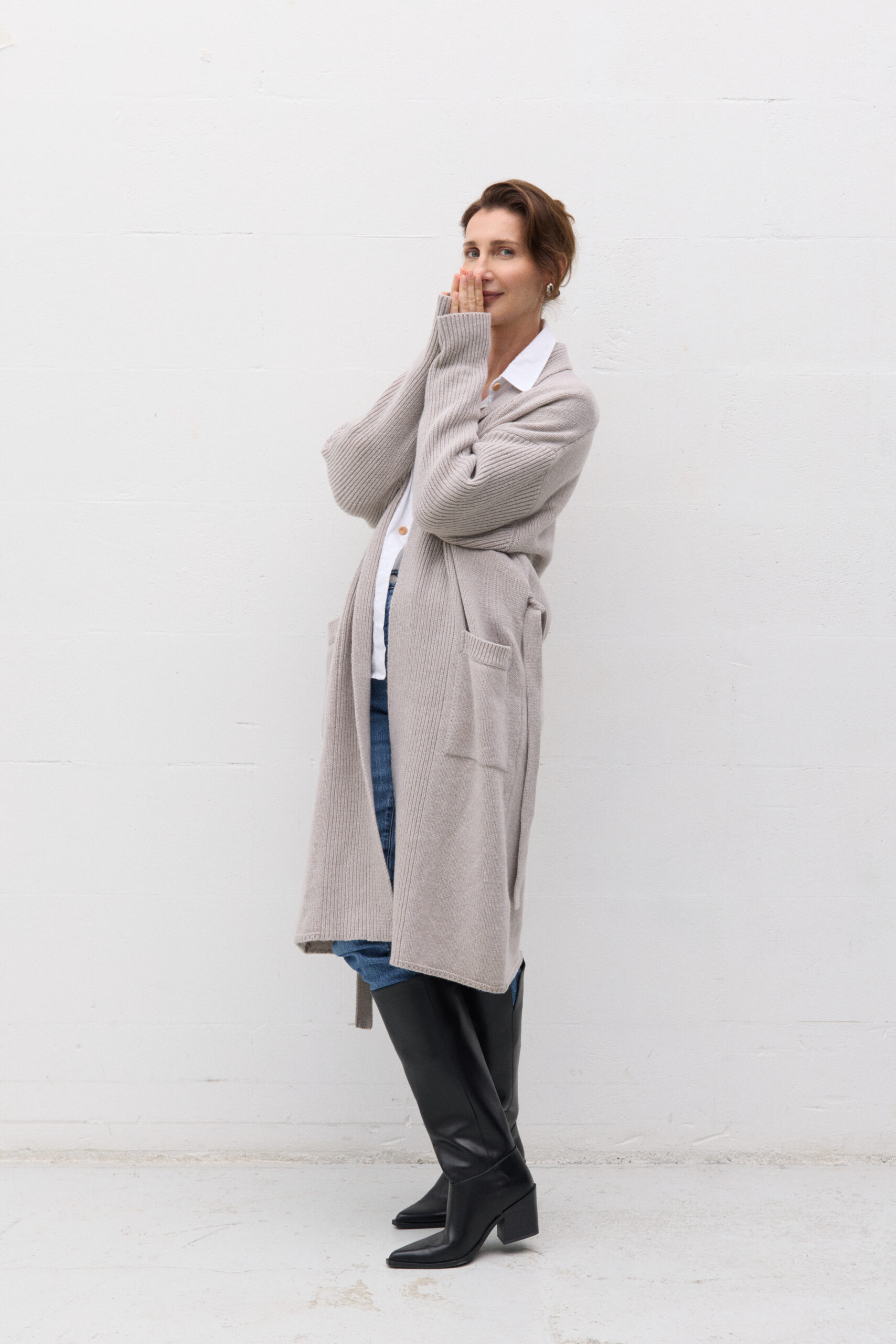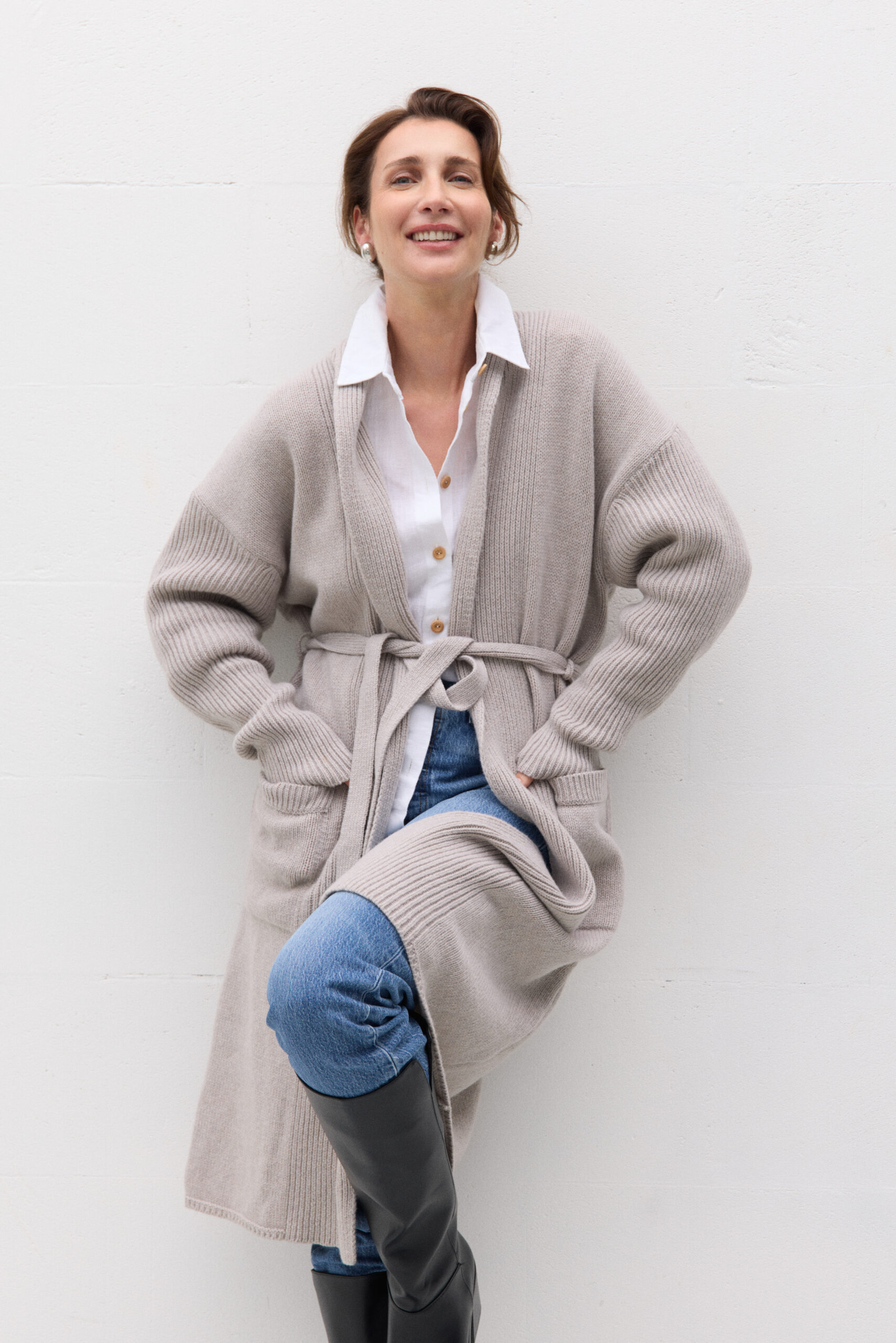 Monza to długi kardigan damski stworzony z myślą o otuleniu. Wiązany paskiem z tej samej dzianiny albo… z Twoim ulubionym, skórzanym.