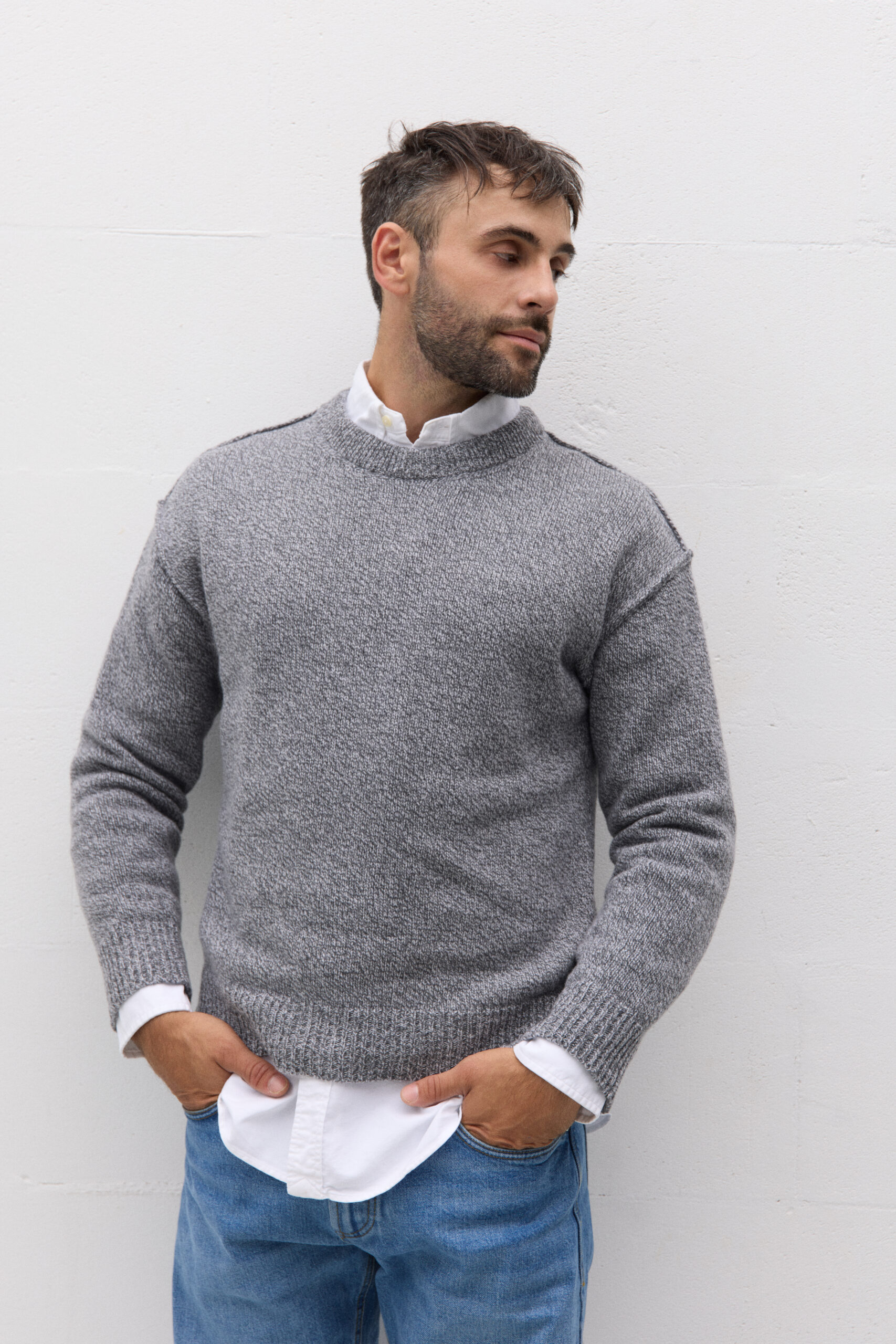 Uszyty z przędzy o składzie: 90% miękkiej wełny merino i 10% kaszmiru, jest nieco grubszy niż klasyczne modele, ale wciąż wygodny i przewiewny – idealny na chłodniejsze dni, zarówno do pracy, jak i po godzinach.